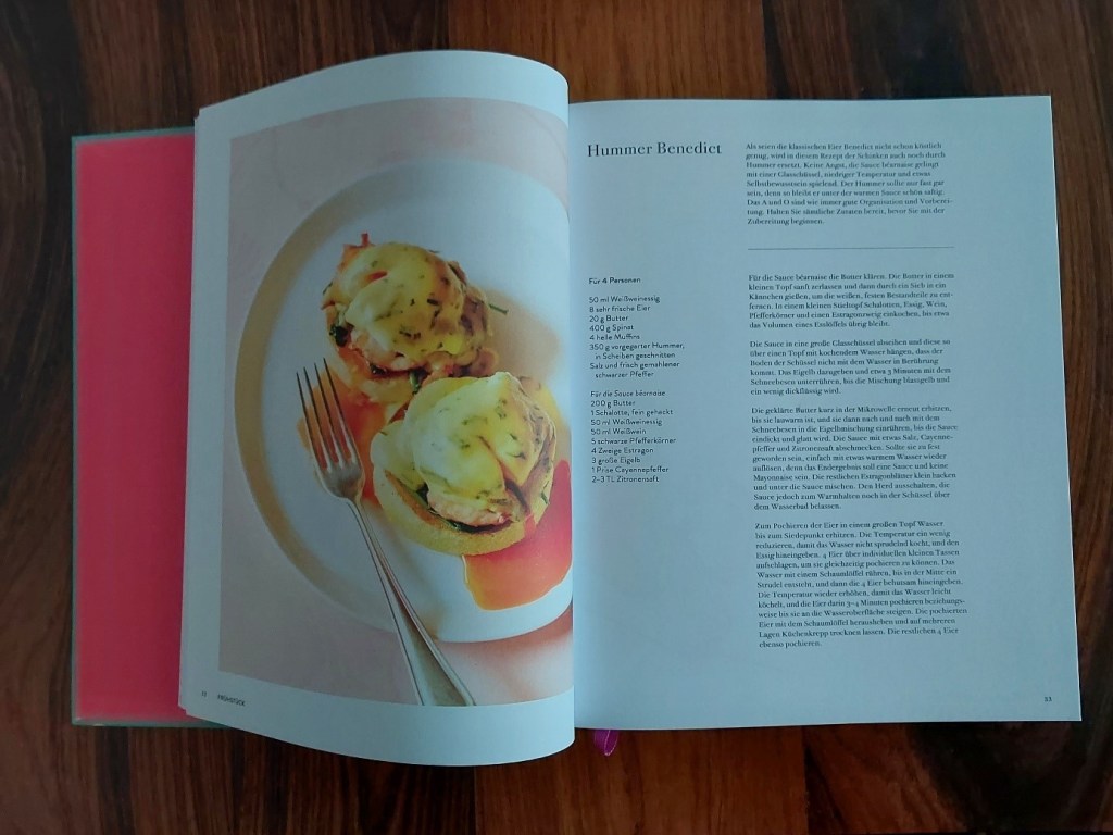 Die erste Mahlzeit, die im Rezeptteil abgehandelt wird, ist naheliegenderweise das Frühstück mit 15 Rezepten. Neben Klassikern wie Porridge finden hier eigens von Fortnum & Mason ersonnene Gerichte Berücksichtigung. Hierzu zählen außer Hummer Benedict, geröstete Crumpets mit Marmite und pochierten Eiern, eine Kedgeree-Reispfanne mit geräuchertem Schellfisch auch eher abseitige Gerichte wie Schinken mit Orangenmarmeladenglasur und gebratenen Enteneiern (mit Bild) sowie Bratwurst, mit Orangenmarmelade überzogen (leider ohne bildliche Illustration). Der erste Reflex der meisten kontinentalen Leser auf mit Orangenmarmelade beschmierte Bratwürste dürfte wohl dem von Obelix beim Anblick des ersten Wildschweins in Mintsauce ähneln; aber interkulturelles Essen erfordert nicht nur Appetit, sondern auch Courage.