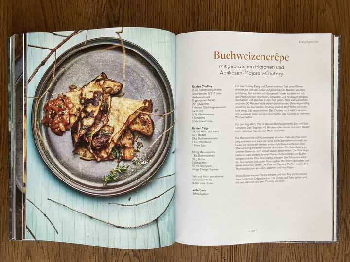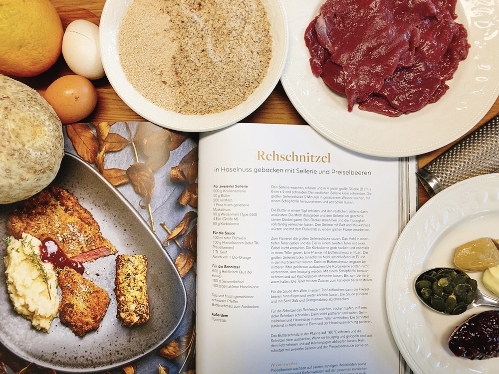 Warum ich das schreibe? Weil das Buch kein reines Wildkochbuch ist, sondern auch zahlreiche vegetarische Gerichte enthält, z.B. Salat von rohen Steinpilzen mit Wildkräuterpesto und Walnusskernen oder Topinambur mit eingelegten Fichtentrieben und Vogelmiere. Klingt auch spannend und ist ansprechend fotografiert, müsste man eigentlich mal testen… aber inzwischen habe ich Reh aufgetaut. Schnitzel in Haselnuss mit zweierlei vom Sellerie als Beilage soll es geben (wer isst nicht gerne Schnitzel?).