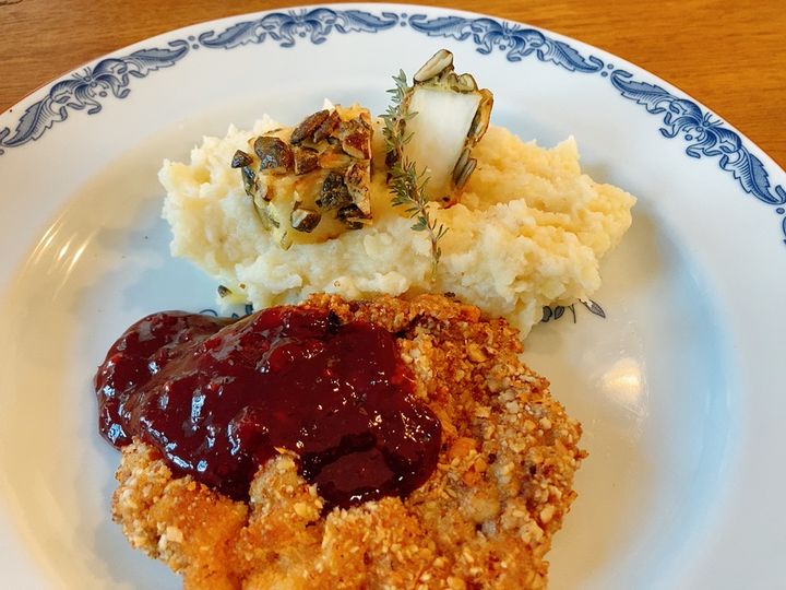 Rehschnitzel in Haselnuss gebacken mit Sellerie und Preiselbeeren