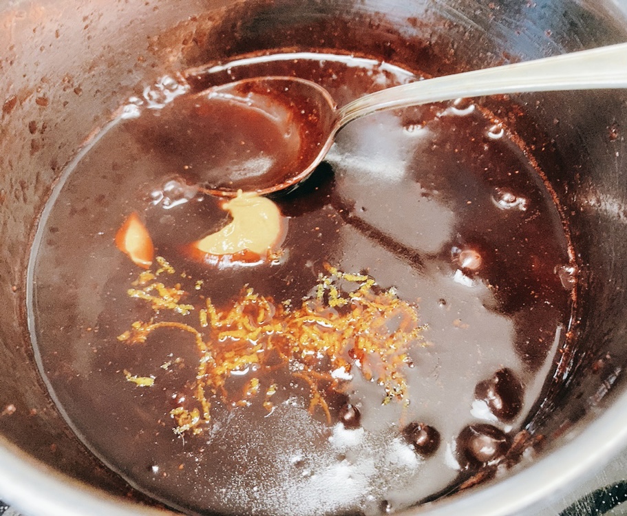 Für die noch fehlende Sauce in einem Topf Portwein aufkochen, Preiselbeeren zugeben und pürieren (zwischendurch Sellerie-Sticks und Rehschnitzel im Auge behalten), mit etwas Senf, Salz und Orangenabrieb abschmecken, auch fertig.
