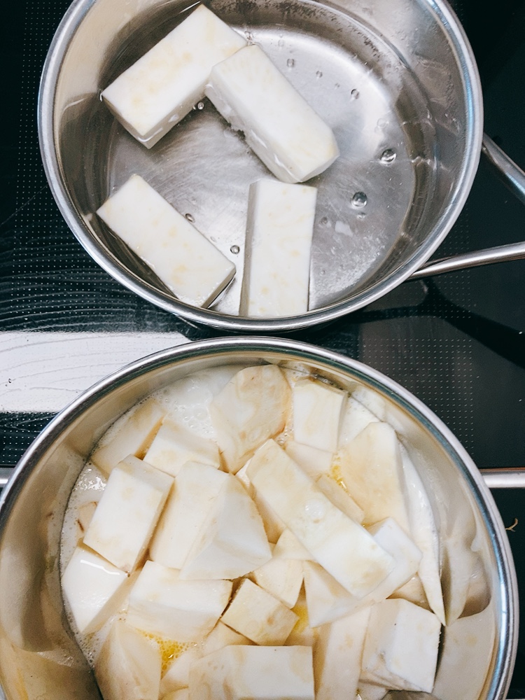 Zunächst wird der Sellerie geputzt und zum einen in vier gleich große Rechtecke, zum anderen in kleine Würfel geschnitten. Die Rechtecke werden kurz in Salzwasser gekocht, sie sollen später panierte Sellerie-Sticks werden. Die Würfel werden in Milch gegart, aus ihnen soll später ein mit Muskatnuss gewürztes Püree werden.