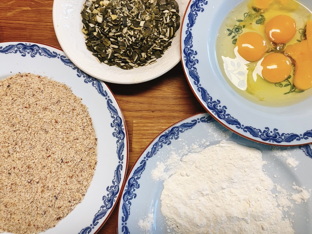 Als nächster Schritt wird eine Panierstraße aufgebaut. Die üblichen Semmelbrösel werden 1:1 mit gemahlenen Haselnüssen gemischt. Der Sellerie bekommt keine klassische Panade sondern eine aus gehackten Kernen.