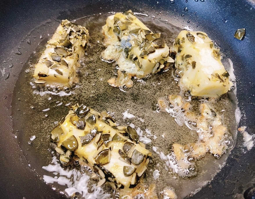 In einer Pfanne Butterschmalz erhitzen. Selleriestücke erst in Mehl, dann in verquirltem Ei, dann in den gehackten Kernen wenden. Anschließend in dem heißen Butterschmalz ausbacken. Hitze nicht zu hoch wählen, da die Kerne ansonsten schnell verbrennen und der Sellerie im Zweifelsfall trotz vorkochen nicht gar wird.