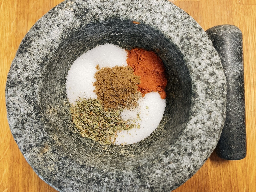 Anschließend wird aus Salz, Zucker, Kümmel, Majoran und Paprikapulver eine Trockenmarinade hergestellt („Rub“ würde man wohl auf neudeutsch sagen) und das Fleisch damit eingerieben.