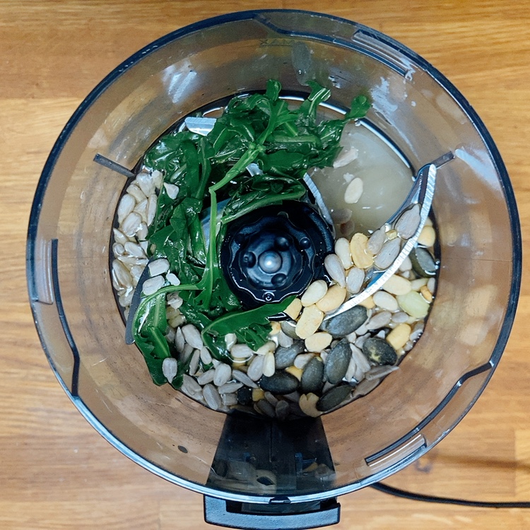 Relativ frisch zubereiten sollte man das Pesto. Zum Glück habe ich einen Naturgarten und keinen englischen Rasen, so dass ich nach wenigen Schritten ausreichend Löwenzahnblätter für das Pesto habe. Zusammen mit Kernen, Öl und Honig sowie Salz und Pfeffer werden die (kurz in Salzwasser blanchierten) Löwenzahnblätter im Mixer zu einem Pesto verarbeitet.
