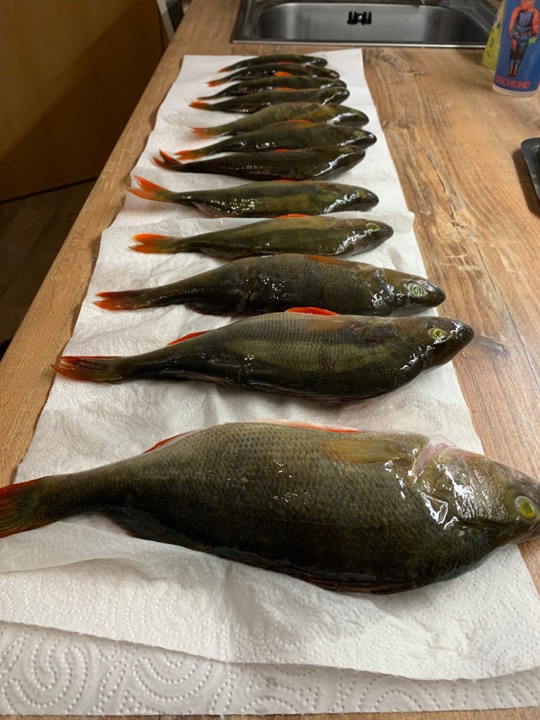 So fing ich zwischen August und Anfang Oktober an jedem Angeltag mindestens 2 Barsche in Handlänge oder größer, die ich dann im Gefrierschrank sammelte.