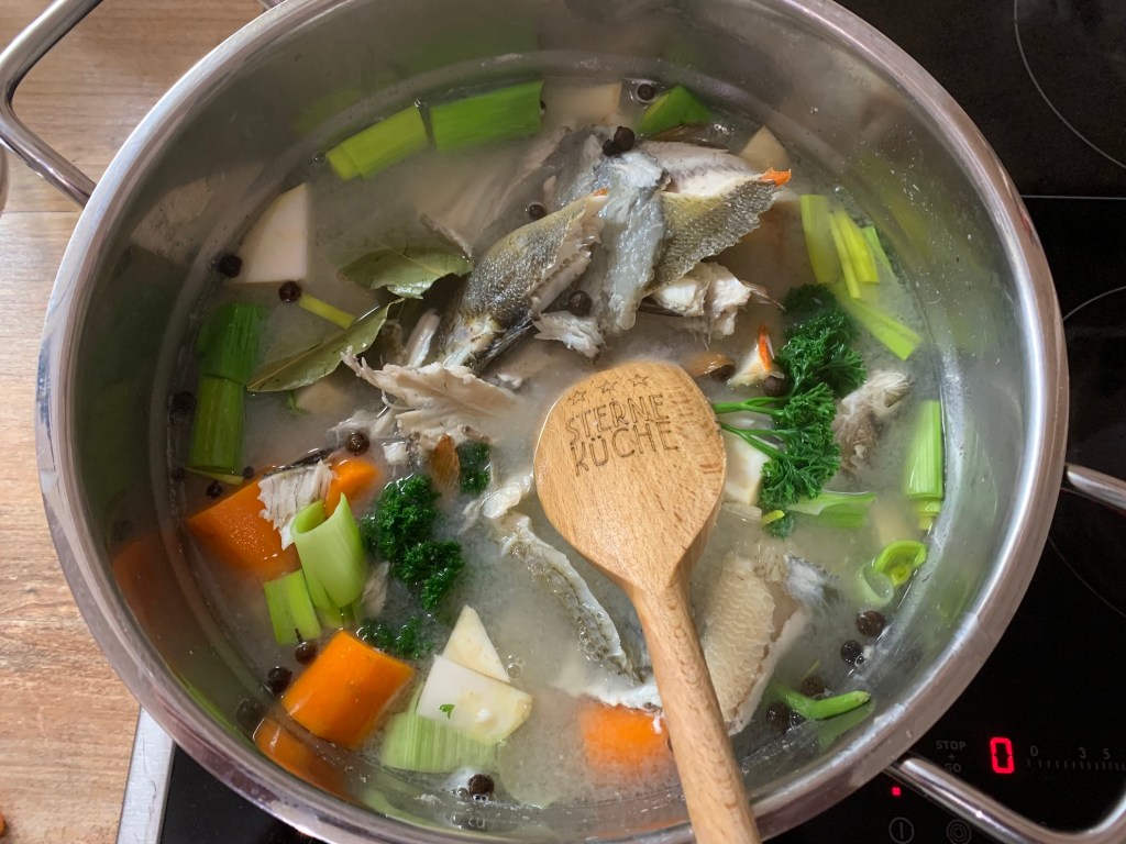 Die ausgenommenen Barsche gründlich waschen und filetieren. Die Karkassen, Flossen und Haut (und kleine Fische im Ganzen) mit einer ¾ Flasche Wein und 1 l Wasser langsam zum Kochen bringen. Entstehenden Schaum abschöpfen, danach das grob geschnittene Suppengrün, Lorbeerblätter, Pfeffer- und Pimentkörner zugeben. Das Ganze mindestens 1,5 h kochen, gern auch länger, umso kräftiger wird die Brühe. Man kann die Brühe am Schluss klären, ich mag sie aber lieber trüb. Für das Risotto ist das Klären auch nicht nötig.