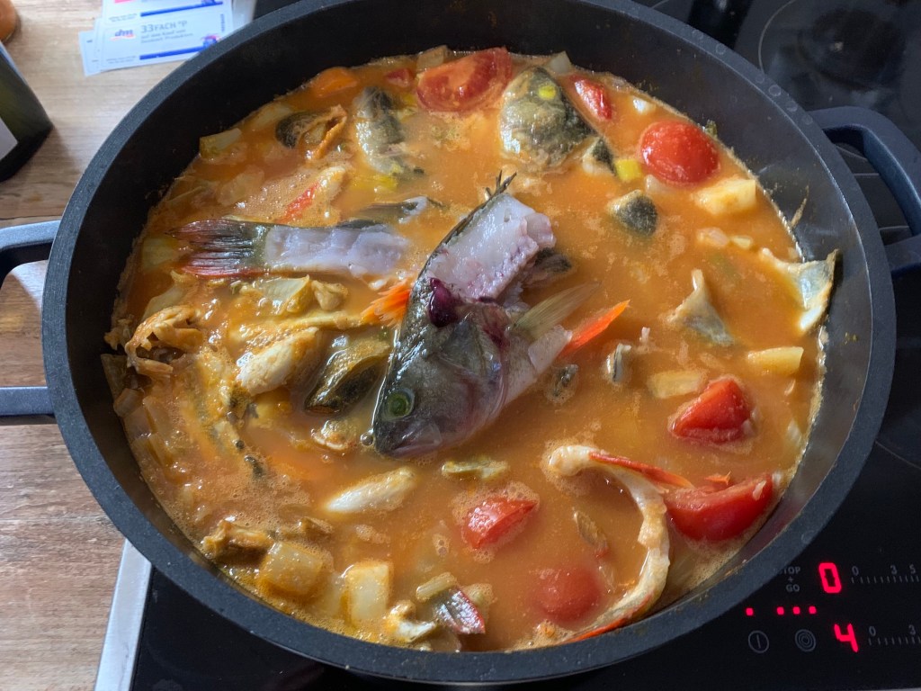 Aus dem ersten Schwung von etwa 10 Fischen kochte ich eine ordentliche Fischsuppe nach Art einer Bouillabaise mit Filetstreifen.