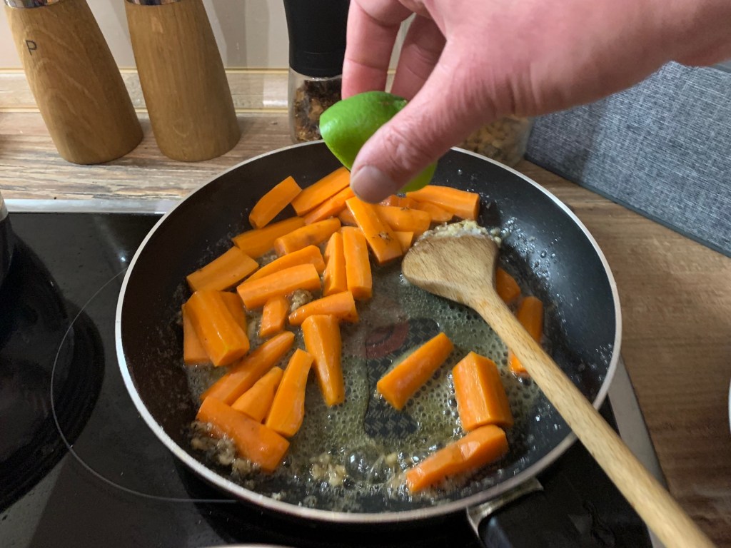 Wenn die Butter geschmolzen ist, die Möhrenstücke zugeben und kurz durchschwenken. Mit etwas Weißwein und Limettensaft ablöschen, abdecken und ca. 10-15 Minuten garen lassen, bis die Flüssigkeit verdampft ist.