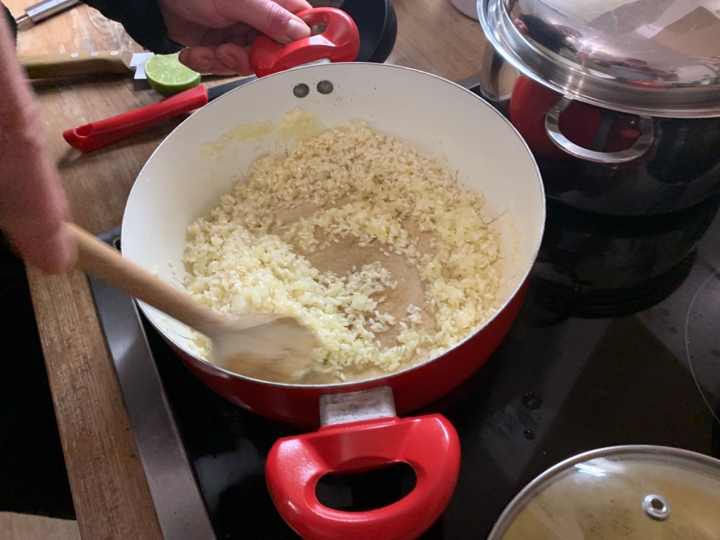 Dann mit einer Kelle heißer Brühe ablöschen und unterrühren, bis sie vom Reis aufgenommen wurde, dann wieder etwas heiße Brühe zugeben und das so lange unter ständigem Rühren fortsetzen, bis das Risotto schön cremig ist, aber der Reis noch Biss hat. Wichtig ist, wirklich die ganze Zeit gut zu rühren.