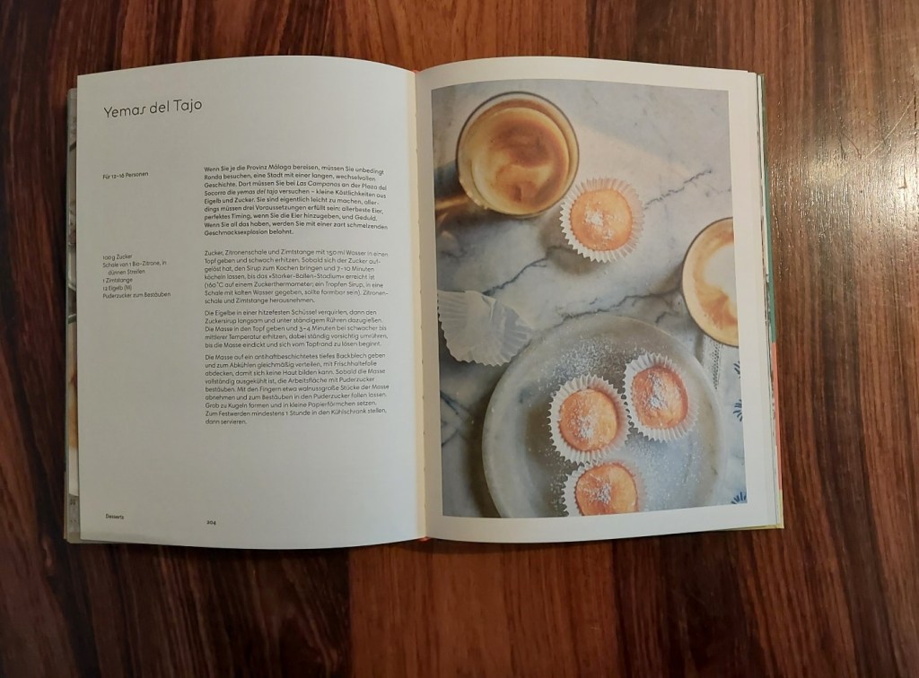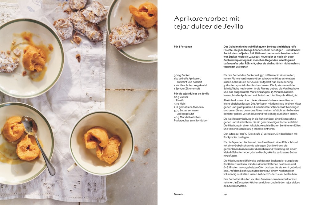 Den letzten Rezeptabschnitt bilden die Desserts. Hier werden Rezepte für Sherry-Halbgefrorenes mit Walnüssen & Honig, Tortas de aceite – eine Art Fenchelkeks –, Pionono aus Santa Fè mit Holunderblüte – so etwas wie ein Cremetörtchen –, Kürbis-Kastanien-Puffer oder Kaktusfeigen-Margarita.