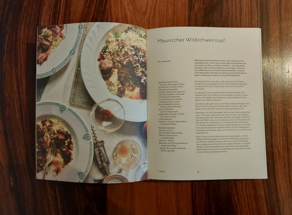 Für die Zwecke der Rezension wurde der Maurische Wildschweintopf ausgetestet, der geruchlich sehr ansprechend ausfiel; bei genauer Befolgung der Anweisungen läuft das Fleisch allerdings Gefahr, recht trocken auszufallen. Kulinarhistorisch mag das Rezept die Frage aufwerfen, ob gerade die Mauren – immerhin vorwiegend dem Islam angehörende Berberstämme – Wildschweinfleisch zugesprochen haben mögen und dazu noch in Sherry mariniert hätten; aber dieser Gedanke ist möglicherweise zu kleinlich.