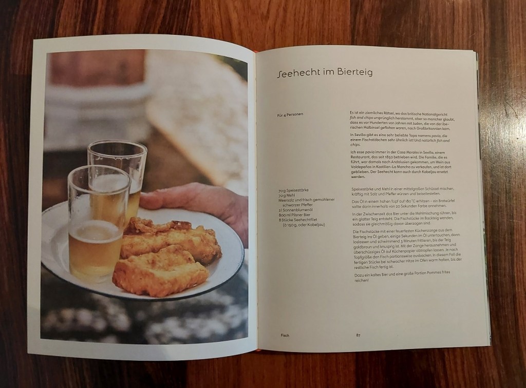 Getestet wurde das Rezept für Seehecht im Bierteig, das angeblich als Vorläufer für die britischen Fisch & Chips diente. Für den Bierteig wird hier die Vermischung von 800 ml Pilsner Bier mit jeweils 70g Stärke und 70g Mehl gefordert, was dann freilich nicht unbedingt zu einem am Fisch haftenden Bierteig führt; ob man nun den Fisch einmal im mit Mehl und Stärke vermischten Bier schwimmen ließ oder nicht, machte für das Ergebnis keinen großen Unterschied. Wenn man dagegen die Anteile von Flüssigkeit zu Mehl und Stärke aneinander angleicht, erhält man immerhin eine reelle Chance auf einen Teig.