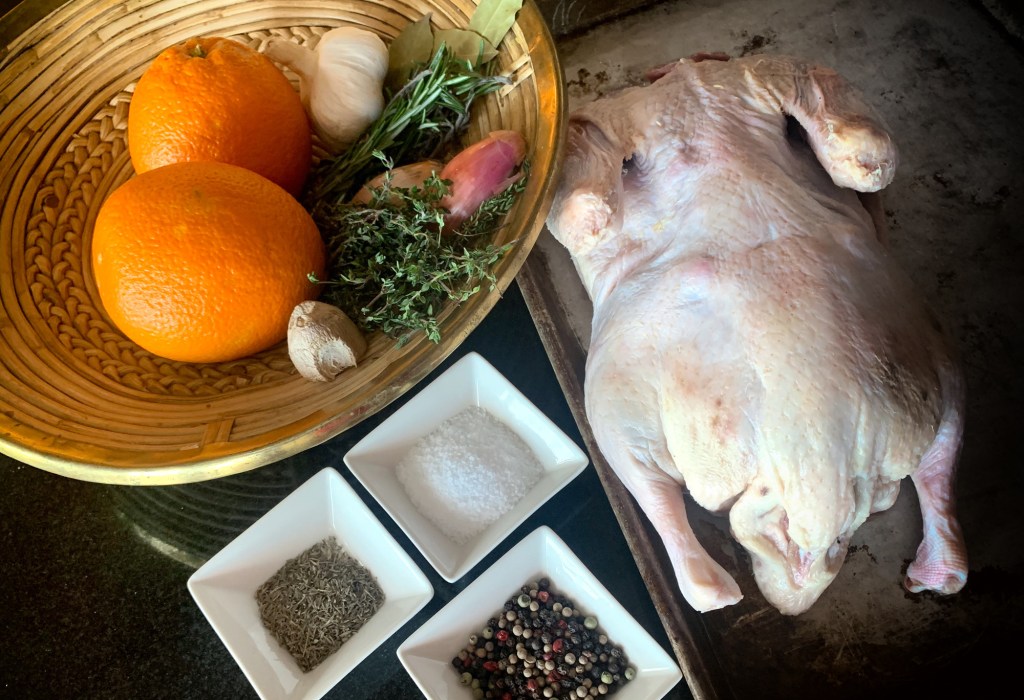 Ich konfiere die Schenkel und Keulen, eingerieben mit aromatischen Kräutern, Salz und Pfeffer und ein wenig Zitrusabrieb, in Enten oder Gänsefett. Dazu werden sie einzeln mit zwei Esslöffeln Gänse oder Entenfett vakuumiert und dann etwa 12-16 Stunden bei 80 °C in meinem Sous Vide konfiert. Diese Methode ist unglaublich einfach und braucht wesentlich weniger Fett, als wenn man es im Ofen macht. Die Zeit mache ich abhängig von der Größe und dem Alter des Vogels.