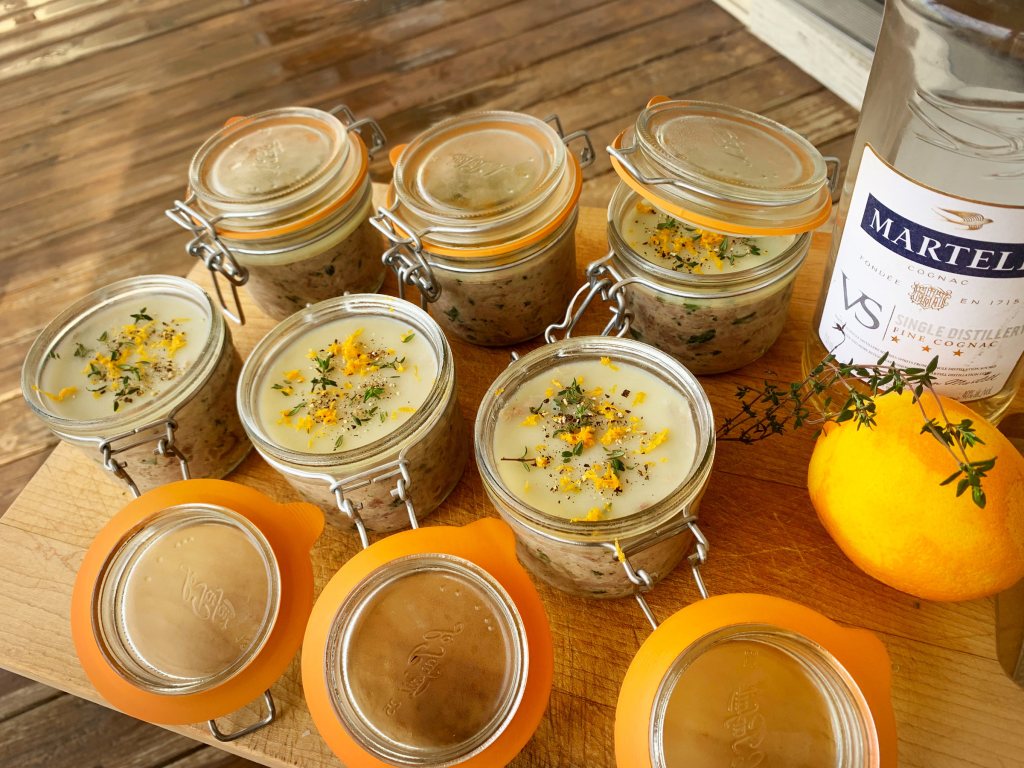Die Rillettes wird in kleine Gefäße gefüllt, die man mit Hilfe einer Gummidichtung luftdicht verschließen kann. Auf die glattgestrichene Rillettes Masse sollte man eine dünne Schicht flüssiges Enten oder Gänsefett geben, um es luftdicht zu versiegeln. Auf meinen Fotos habe ich etwas Thymian und Orangenabrieb für die Optik gegeben. Das ist nett für die Präsentation, kann aber zu Schimmel-Problemen führen. Die Rillettes kann sofort verzehrt werden, hält sich aber im Kühlschrank ohne Probleme über mehrere Monate (ohne die Dekoration).