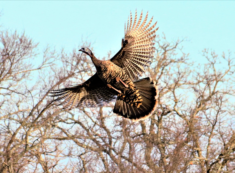 Der wilde Truthahn fliegt sehr selten, eigentlich nur wenn er seinen Schlafplatz hoch oben in den Eichen am Morgen verlässt oder diesen am Abend wieder aufsucht. Und in Momenten der größten Gefahr.