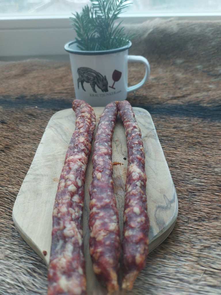 Meine „November-Sau“ sollte zusammen mit etwas Reh und Damwild den Einstieg in die Produktion von Rohwurstwaren in Form von Pfefferbeißern ebnen.