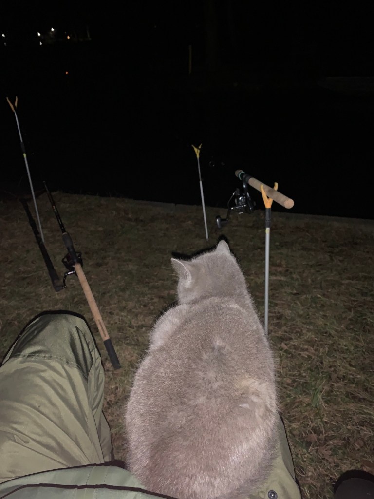 Gebissen hat bis zum späten Abend nichts, bis auf einen Kaulbarsch, den ich bei der Köderkontrolle an der Feeder entdeckte. Dafür war im Laufe des Abends meine Tüte mit den restlichen zwei Köderfischen verschwunden. Kurze Zeit später sprang mir die erste Verdächtige auf den Schoß und ließ sich, leise schnurrend, kraulen. Ich sehe das mal als Dankeschön.