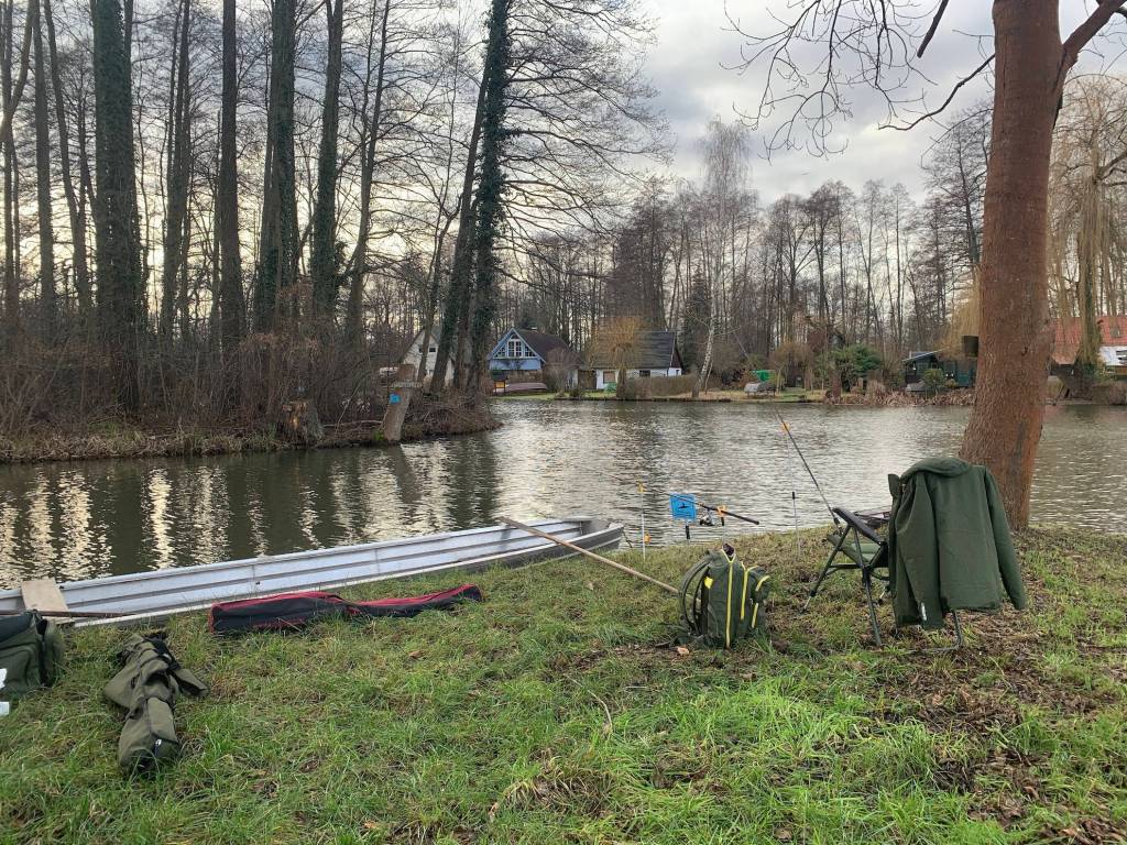 Somit kam wieder die Feederrute mit Dendrobena und 50 g-Strömungsblei zum Einsatz. Meine zweite Rute war eine DAM #1 mit einer Daiwa Crossfire 4000 und einer gefrorenen Sardine am System mit 2 kleinen Drillingen. Während ich es mir in der recht warmen Sonne gemütlich machte, es waren tatsächlich 17° C, versuchte sich mein Mitangler im aktiven Fischen mit verschiedenen Montagen und Kunst- und Naturködern. DropShot, Jig, Carolina-Rig, Wurm, 5cm-Gummifisch und Krebsimitat warf er an so ziemlich allen Stellen, die erreichbar waren ins Wasser und führte sie mal schnell und zackig, mal langsam zurück – kein einziger Biss! Die Fische haben das mit der Stille wohl falsch verstanden. Bei mir sah es nicht besser aus, obwohl ich meine Köder auch an verschiedenen Stellen und vermeintlichen Kanten anbot. Die „hilfreichen“ Tipps und neugierigen Fragen von diversen Kahn- und Paddelbootfahrenden trugen nicht grad zu einer Verbesserung der Stimmung bei.