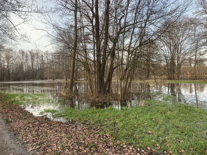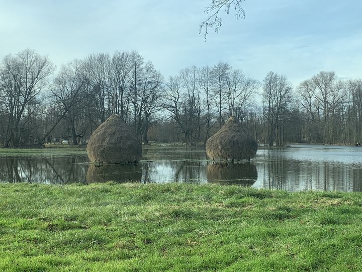 Wir erreichten nach einer einstündigen Fahrt eine kleine Wiese, die als Parkplatz dient und mit verschiedenen landwirtschaftlichen Geräten bestückt und von kleinen Fließen eingerahmt ist. Eine angrenzende Wiese ist überflutet, Bäume stehen im Wasser. Und dann diese Ruhe, ja Stille.