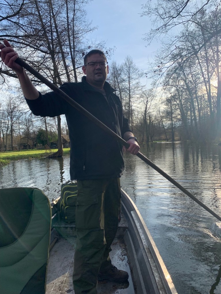 Am Silvestertag gab es, nach einem üppigen Frühstück, eine Einweisung auf dem Kahn. Das sieht so einfach aus, wenn man die Bootsführer, auf den 10 m langen Kähnen mit bis zu 30 Personen an Bord, durch die schmalen Fließe staken sieht. Ich fuhr mit dem kleinen 4 m-Kahn erstmal nur im Zick-Zack. Doch nach einigen Tipps und Hilfestellungen hatte ich den Bogen einigermaßen raus. Wir holten unser Angelzeug, ließen uns noch eine gute Stelle verraten und dann ging es los.