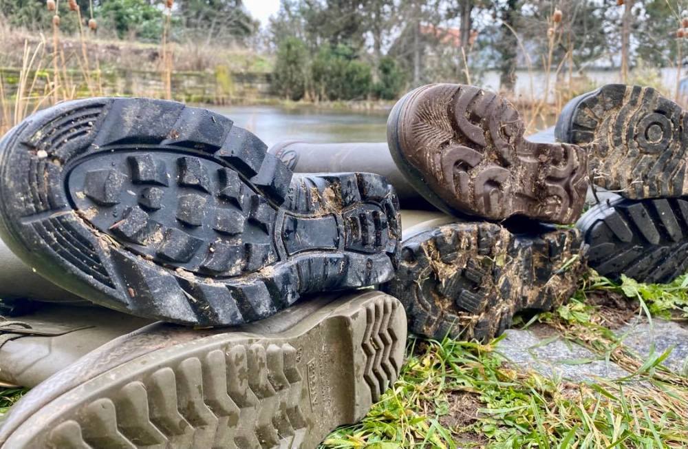 Dank seines – KRAUTJUNKERs – Hinweises nämlich habe ich mich mal an die Stiefel dieser Marke herangetraut. Das hervorstechendste Merkmal in meinen Augen: Sie kommen AB WERK zu klein daher. Sie sind also in der 43 perfekt für 42,5. Für wirklich dicke oder zwei Paar Socken müsste man dann wieder auf den Mechanismus des sich anpassenden Fußes zurückgreifen. Aber der Nordforest Hunting Jagd-Gummistiefel Hubertus Neo, wie er offiziell geführt wird, protzt, Neo eben, mit 4-mm-Neoprenfutter. Und das hilft schon. Da reichen normale Wollsocken völlig. Und wenn es richtig eisekalt ist wird das Verhältnis von Gummistiefel zu Wasser rein physikalisch auch eher religiös: Man kann darüber hinweggehen. Dass die Nordforest AB WERK zu klein sind, würde natürlich niemand zugeben, bei Nordforest. Angeblich entspricht der Nordforest Hunting Jagd-Gummistiefel Hubertus Neo in Größe 43 der UK 9, der Katalog des Verkäufers gibt die Fußlänge in Millimeter mit 270-276 an. Das mag so sein, ich nahm nicht Maß. Jetzt ist das mit den Größentabellen der Hersteller und den Umrechnungstabellen aber so eine Sache. Darüber müsste man einen eigenen Text verfassen, hätte das nicht schon mal jemand erledigt und seine Erkenntnisse bei Wikipedia eingestellt. Wer also wissen will, warum man um das Aus- und Anprobieren nicht herumkommt, der sei dahin verwiesen. Und wenn es über den Nordforest Hunting im Katalog heißt, er sei durch seine „gute Passform komfortabel zu tragen“, so kann zumindest ich dem zustimmen: Er sitzt am Fuß ein wenig saugender als alle anderen bei mir oder beim Händler stehenden Modelle, die ich probiert habe. Für Spaß und diesen Beitrag hier habe ich mir ein getragenes Modell angesehen. Da muss man leider feststellen, dass die Aigle meiner Frau besser durch die Jahre gekommen sind, obwohl sie auf der Jagd und draußen fast nur noch ihre Parcours trägt.