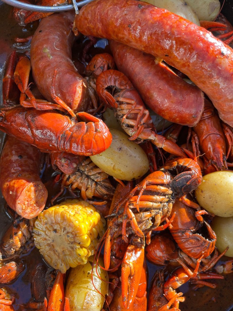 Die Zutaten der Cajun Crawfish Boil im Dutch Oven sind kostengünstig, sofern man keine Flusskrebse im Feinkosthandel erwerben muss. Da kosten sie aktuell zwischen 15 und 19 € das Kilogramm. Meine waren kostenfrei. Wie man bei diesem Mise en Place schön sehen kann, halten sich die Cajuns auch nicht groß damit auf, die Maiskörner von den Kolben und die Orangen von den Schalen zu befreien oder gar den Knoblauch zu schälen und von seinem grünen Keim zu befreien. Man muss sich hier nicht eng an die Vorgaben von Zeit und Zutaten halten. Ich schätze mal die Cajuns hatten keine Uhren und keine Küchenwaagen… Ich hab da Huckleberry Finns mit französischem Akzent im Kopfkino. Hawk arbeitete instinktiv und ziemlich schnell, ich unterstütze nach Kräften und meine Notizen sind im Nachhinein etwas wirr und widersprüchlich. Wen das stresst, der möge einfach zum Bourbon greifen und nachschenken.