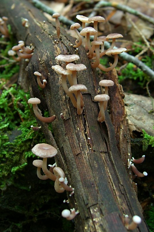 Groß ist ihre Anzahl nach heftigen Regengüssen. Aber wie es sich für edle Retter gehört, legen Knoblauchschwindlinge großen Wert auf angemessene Privatsphäre. Der eine auf abgebrochenen Ästen, Zweigen oder Stümpfen, der andere auf blank liegenden Wurzeln oder Zapfenblindgängern, überall wo die Nadelstreifen sich ins rechte Waldlicht rücken. Wohngemeinschaftskollegen von vergleichbarer Statur haben sich sprechende Namen zugelegt: Der Waldfreundrübling (Callyba dryophila), der Halsbandschwindling (Marasmius rotula), das Fasermützchen (Crinipellis stipitaria) das Mäuseschwänzchen (Baeospora myosura) oder das herzige und noch winzigere Käsepilzchen (Marasmius bulliardii).