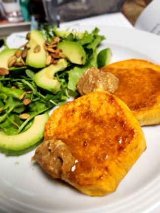 Süßkartoffel mit Misobutter. Im Buch wird die Süßkartoffel im Toaster zubereitet, ich habe mich für den Backofen entschieden. In diesem Rezept vereinen sich mehrere Favoriten von uns Süßkartoffeln, Miso und Zimt.