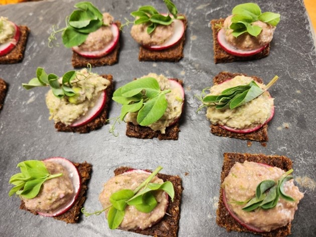 Erbsenpüree mit Radieschen auf Pumpernickel: durch Radieschen und Zitrus wird das Ganze sehr interessant (nicht auf die Alfred-Biolek-Weise 😉). Zuerst hatte ich mit älteren Schoten gearbeitet, die ich vor her gepalt hatte. Das Mus wurde sehr faserig und ich habe es zusätzlich mit Erbsen angereichert, so konnte ich es besser zerkleinern. Geschmacklich kräftiger, die Farbe durch die Zugabe von Zitronensaft gewöhnungsbedürftig. Im zweiten Ansatz komplette junge Schoten, deutlich angenehmer und cremiger. Eine ungewöhnliche Vorspeise, die ich bestimmt wieder machen werde, wenn der Garten es zulässt.