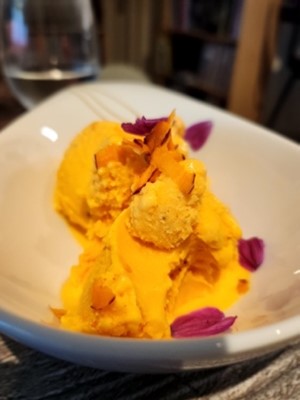 Ein Karotten–Kardamom–Eis reizte mich direkt zum Ausprobieren, und wir wurden nicht enttäuscht. Die Kombi süßliche Möhren und der warme Touch des Gewürzes passen hervorragend zu diesem Dessert.