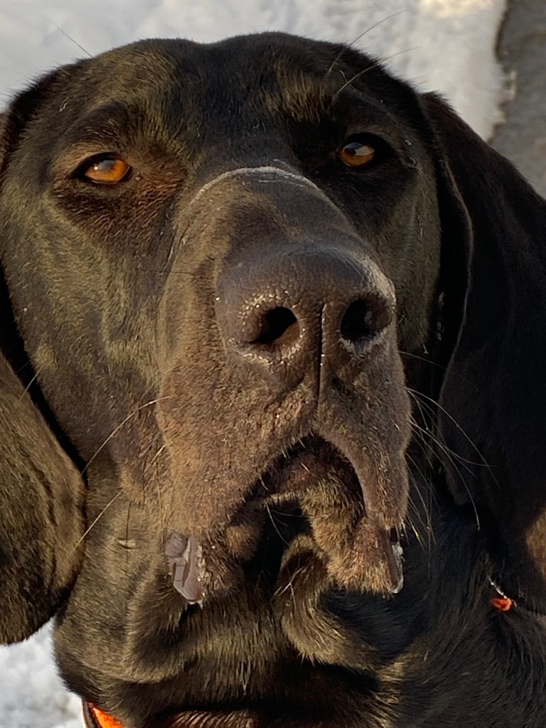 Oft stellt sich die Frage, wie ein Plotthound jagdlich eingesetzt werden kann. Nun das ist in unseren Regionen schon eine Aufgabe. Hugo jagt sehr weit. Wenn er eine Fährte hat, kommen am Vormittag durchaus 25 km zusammen unter Einbezug mehrerer angrenzender Reviere. Aber gut, was soll er tun? Nach 2 km den Kopf schütteln und umdrehen, das ist auch keine Option.
