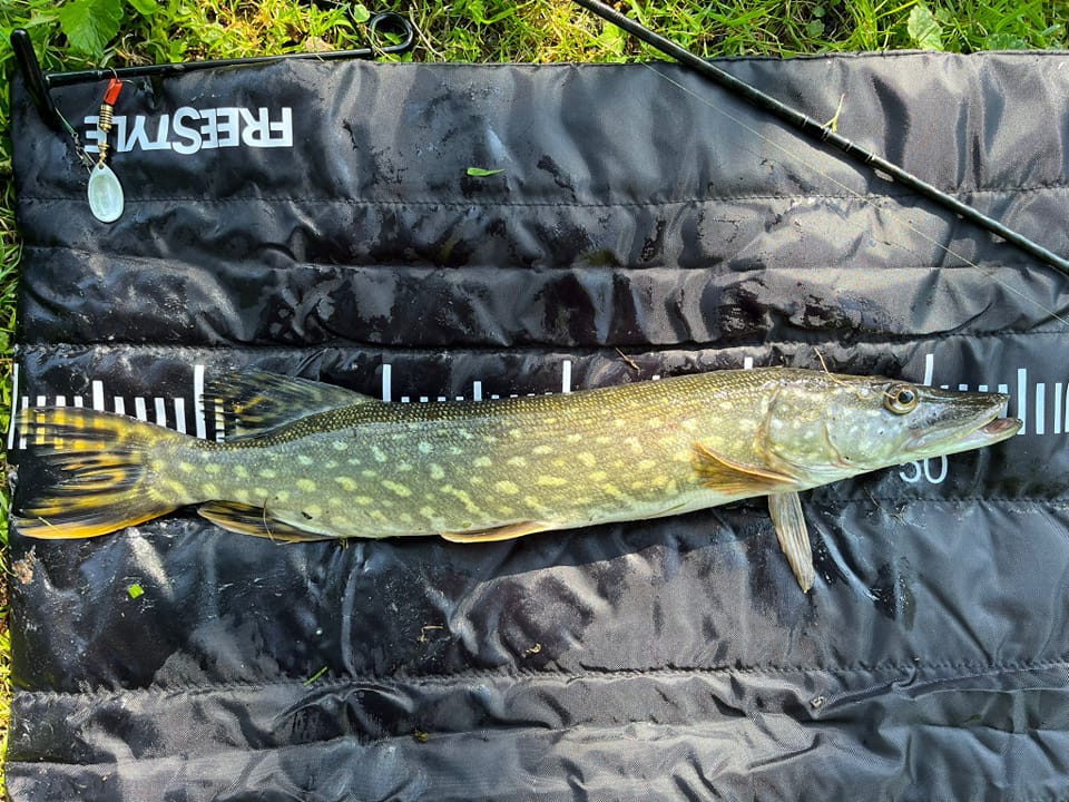 Am 1. Juni fängt in meinen Vereinsgewässern die Spinnfisch-Saison an. Am 5. Juni 2023 später konnte ich mit eine Stunde fürs Angeln abknapsen und schnappte mir ein leichtes Spinnfischerset, bestehend aus einer Rute vom Typ Daiwa Ninja Spin (Länge: 2,10 m, Wurfgewicht 3-15 g), einer Rolle vom Typ Daiwa Freams LT 3000 und fuhr zu den Golfplatzteichen Pödinghausen bei Enger. Die Hälfte der Zeit war ich damit beschäftigt, Schnurperrücken aufzudröseln und neue Vorfächer zu knoten, aber in der restlichen Zeit biss um Viertel vor zehn ein 53 cm langer Hecht an meinen Mepps-Spinner Gr. 3.