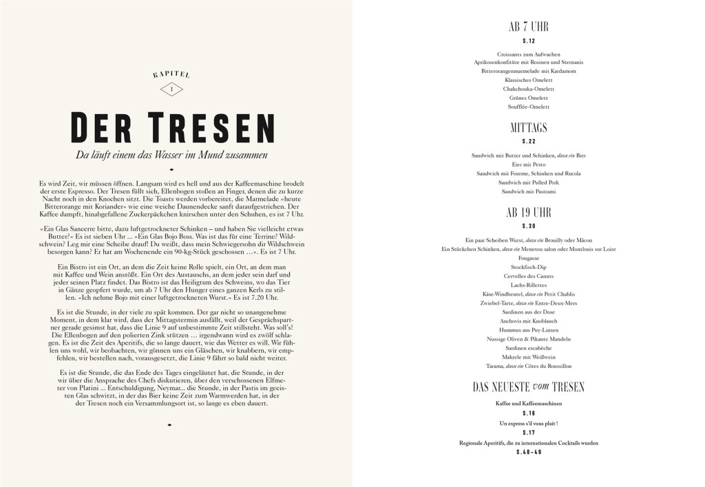 Reynauds Buch ist wie ein Besuch in seinem Bistro strukturiert. Die Innenseite des Umschlags stellt einen Terrazzoboden dar. Es folgen die Willkommensworte des Bistrotier, so heißt der Betreiber und so lautet auch der französische Titel des Buches. Die nächste Doppelseite zeigt die Speisekarte. Diese beginnt damit, was am Tresen morgens, mittags und abends von 7 Uhr bis 23:30 Uhr serviert wird.