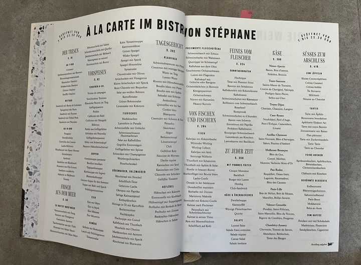 Anschließend folgt die Abteilung Frisch aus dem Meer, welche gemeinhin als Aushängeschild für Bistros und Brasserien gilt. Es folgen die Vorspeisen, aufgefächert in Terrinen, Suppen, Eierspeisen, Gemüse, Fleisch und Fische samt Schalentieren aus Salz- und Süßwasser. Danach kommen die Tagesgerichte, aufgeteilt in Klassiker, Geflügel, preiswerte Fleischstücke und Fisch. Feines vom Fleischer, Zu jeder Zeit, Käse sowie Süßes zum Abschluss sind die nächsten Abschnitte. Zwischen den Gerichten des Inhaltsverzeichnisses sind die Seitenangaben für mehrere kleine Essays eingestreut.