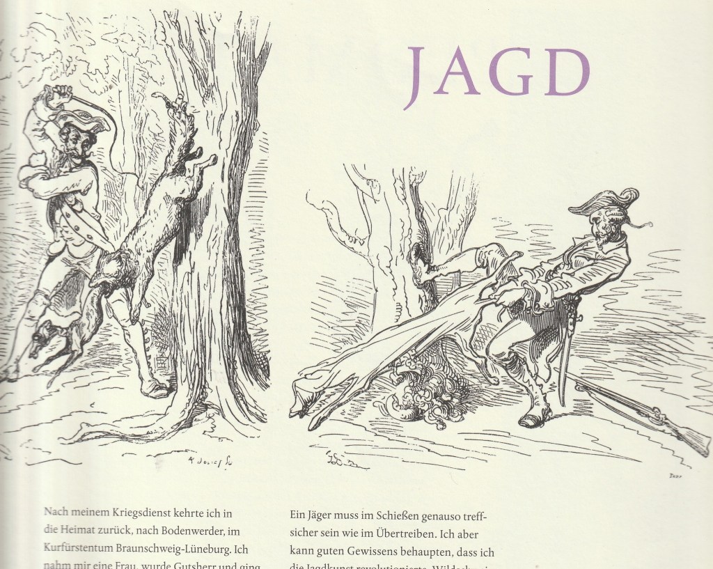 »Nach meinem Kriegsdienst kehrte ich in die Heimat zurück, nach Bodenwerder, im Kurfürstentum Braunschweig-Lüneburg. Ich nahm mir eine Frau, wurde Gutsherr und ging meiner Leidenschaft nach: dem Jagen. Da ich nichts anderes kannte als das Schießen und Töten, wollte ich meine Kunst immerhin noch den Tieren angedeihen lassen. Ein Mensch kann eben nicht aus seiner Haut. Doch er kann manchem Pelzträger dabei behilflich sein, sich der seinen zu entledigen. Nach allerlei mühevollen Versuchen brachte ich es in dieser Kunst so weit, dass manches Tier durch gezielte Hiebe meiner Peitsche wie von selbst aus seinem Balg heraussprang.