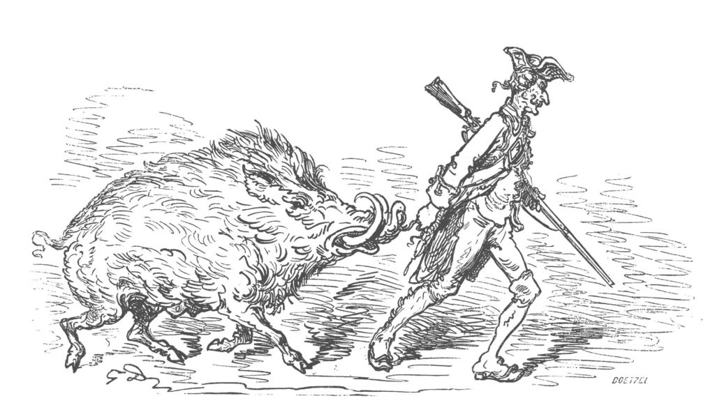 Wildschweine musste ich gar nicht mehr jagen. Ich baute ein so freundliches Verhältnis zu ihrem Volk auf, dass sie freiwillig mit mir nach Hausen kamen. (Jedenfalls die alten, kranken und blinden von ihnen.)«