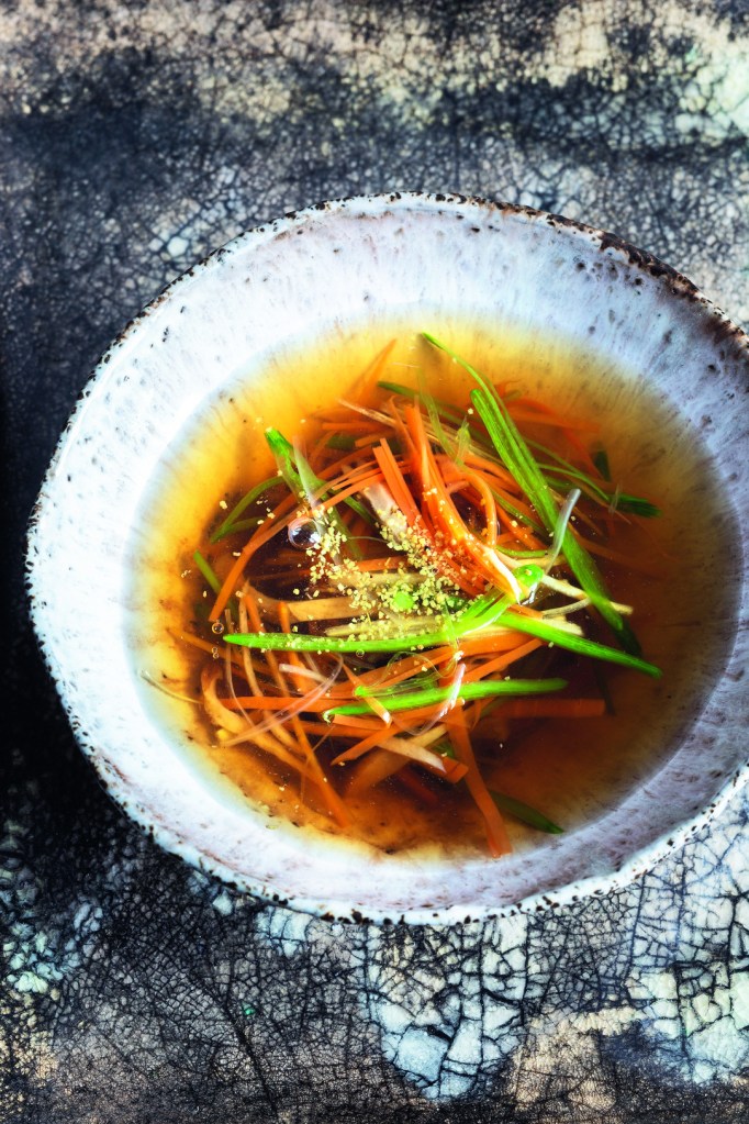 Die Steinpilzsuppe mit den Gemüsestreifen auf vier Schalen verteilen und jeweils mit etwas Sansho-Pfeffer bestreuen. Sofort servieren!
