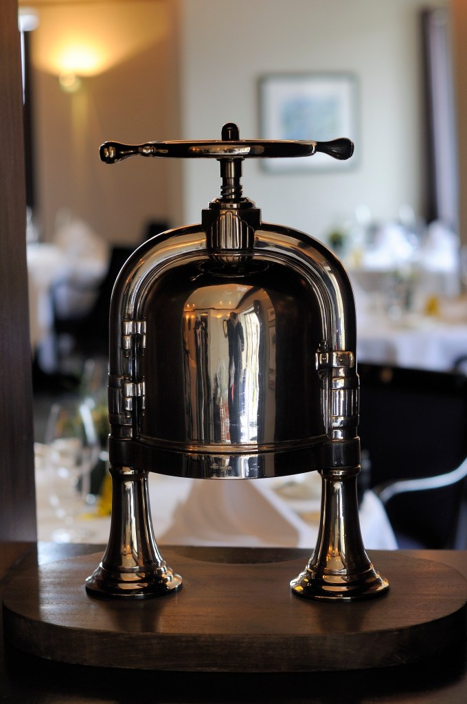 Die Karkasse in einer Entenpresse zerdrücken, das Blut auffangen und in die Sauce gießen.