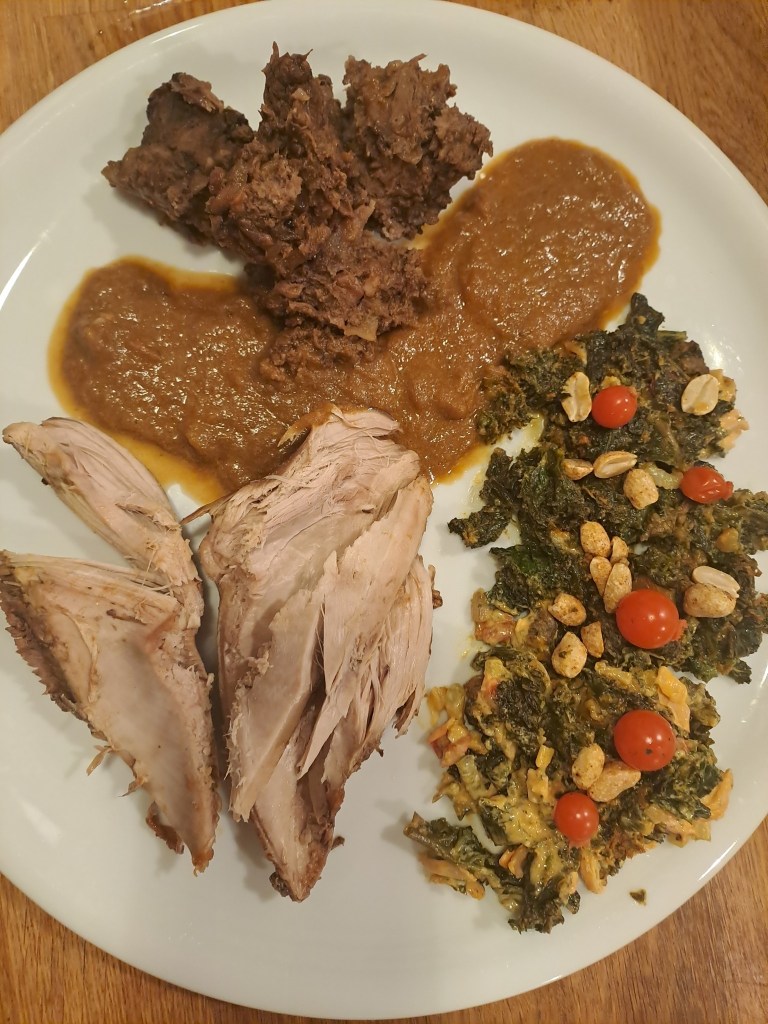 Es wurde ein Sud aus ein paar verfügbaren Gemüsen und ein paar Pilzen und ein wenig Wildfond verwendet und der Fasan ca. zwei Stunden auf niedriger Flamme (Stufe 4 von 9) gar geschmort. Eine Stunde – wie im Rezept angegeben, halte ich für viel zu wenig. Entweder ist dann die Temperatur zu hoch, was das empfindliche Fleisch noch mehr austrocknet oder es ist halt einfach nicht gar. Die Schinkenstreifen habe ich mir auch gespart, zu einen hatte ich keinen im Haus und zum anderen verfälscht der stark gesalzene Schinken den feinen Wildgeschmack des Fasan zu sehr. Ich habe das Fleisch angerichtet mit einem Rest Grünkohl, der Füllung und der aufpürierten Sud mit den Gemüsen. Das war ganz lecker – der Fasan nicht zu trocken, aber der Knaller war die Füllung!