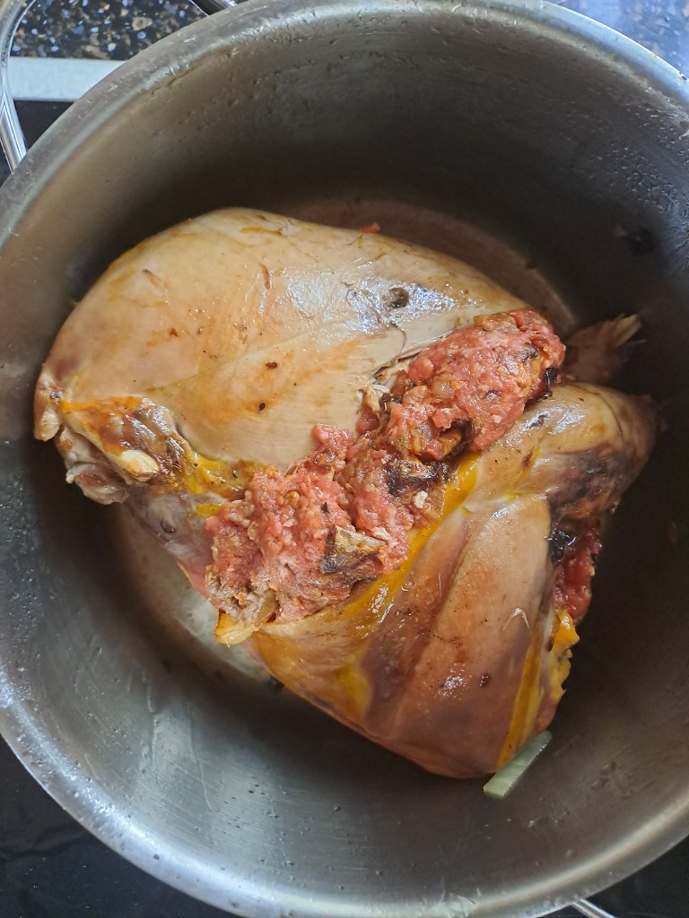 Das Fasantier damit gefüllt und in die Topf in dem die Zwiebeln angeröstet wurden, wird der Fasan angebraten. Ich hatte noch einen Rest roten Glühwein von dem die Hausgemeinschaft geschmacklich nicht so überzeugt war. Zum Ablöschen des Fasans war das genau richtig und gab dem hellen Fleisch auch ein wenig Farbe.