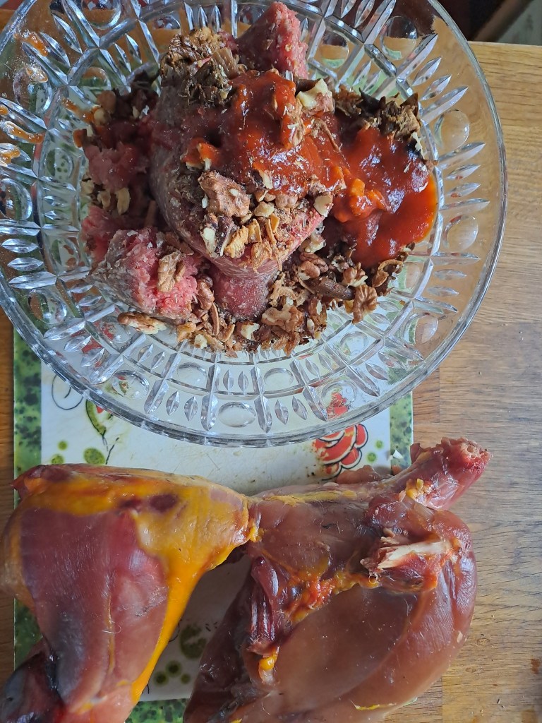 Ich bin also etwas freigiebiger mit der Füllung und verwende ca. 200 g Rinderhack. Im Küchenregal finden sich noch getrocknete Pilze, deren MHD schon etwas überschritten sein dürfte. Als ich das Rezept las, dachte ich von Anfang an, die Pilze müssen in die Füllung und nicht in die Sauce. Also kamen die über Nacht eingeweichten Pilze in die Füllung, zu Fasanenherz, Fasanenleber, einer Hasenleber – alles fein gehackt. Ich hatte noch eine Handvoll dänische Röstzwiebeln – ich liebe dänische Röstzwiebeln – und um nicht als Banause abgestempelt zu werden – ich habe noch ein paar frische Zwiebeln angeröstet und ein wenig Siracha-Sosse, Salz und Pfeffer und nicht zu vergessen, die Walnusskerne für die Füllung gründlich vermengt.
