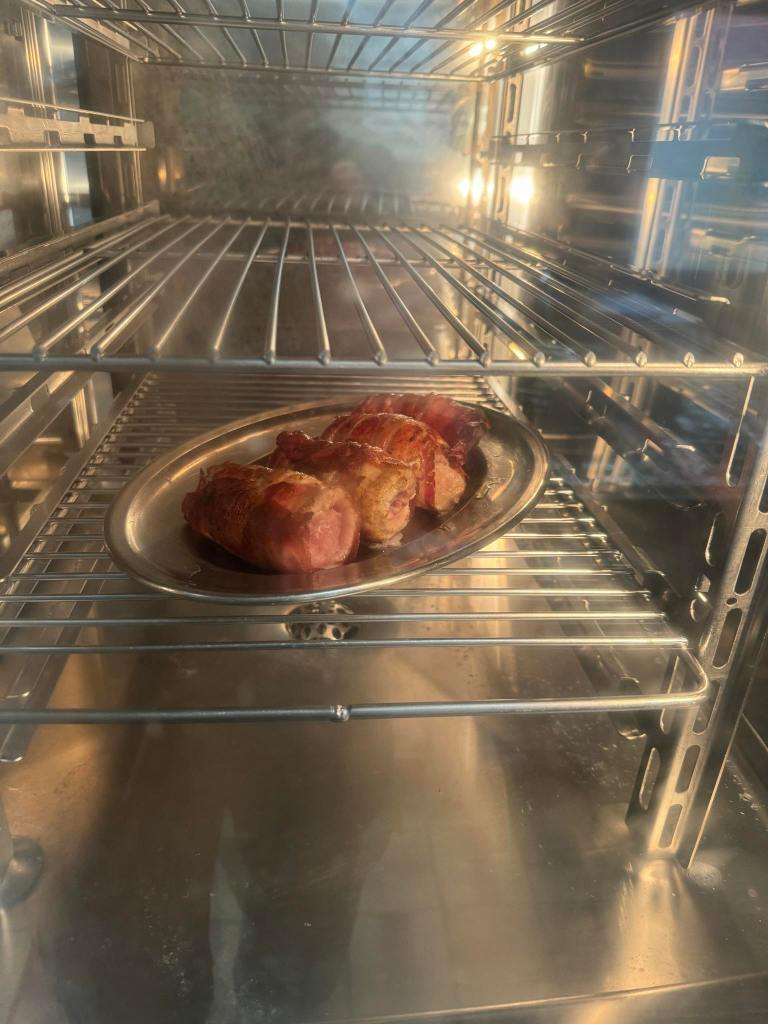Je 2 Speckstreifen auf der Arbeitsfläche nebeneinander legen und mit einem Salbeiblatt belegen. Danach je ein Reinankenfilet (in diesem Fall Welsfilet) mit der Haut nach unten auf das Salbeiblatt legen.