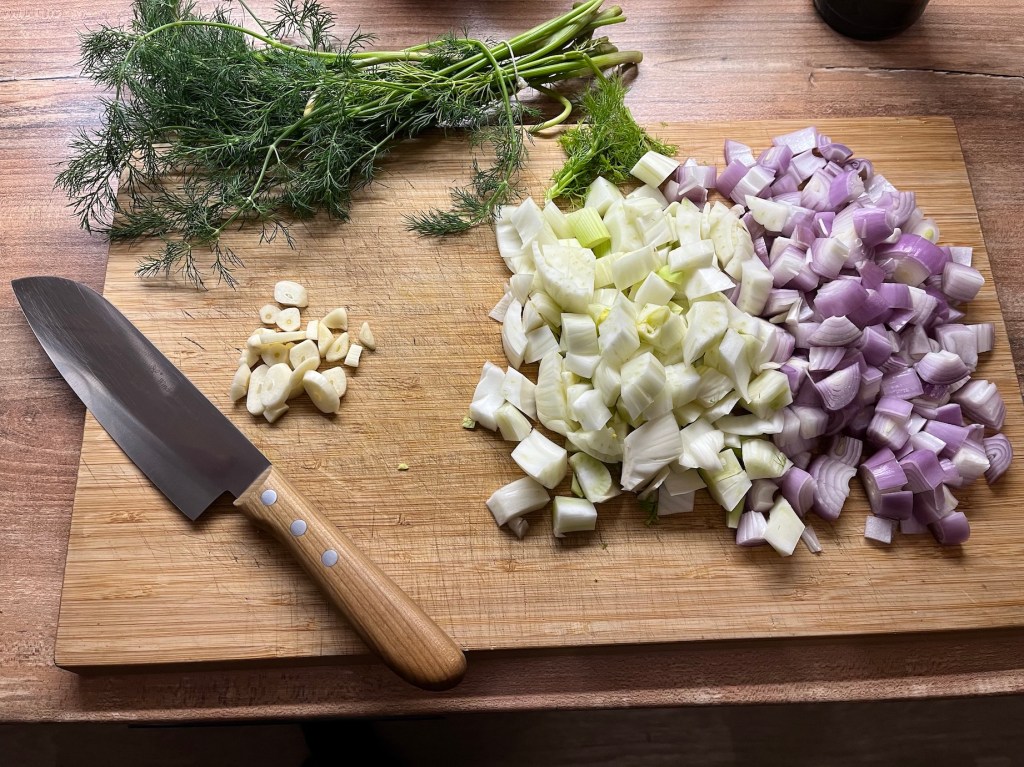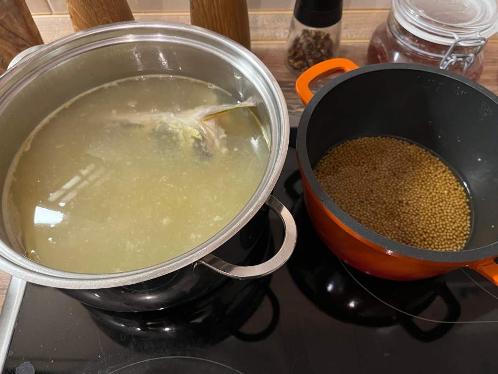 So lud ich meinen besten Freund, der kulinarisch nicht ganz unbeschlagen ist, zum großen Freitagabendkochen ein und präsentierte ihm Rezept und Zutaten. Wir filetierten, schälten, schnitten und hackten uns durch die Zutaten, ich fand noch einen Beutel Barschbrühe im Froster und die ersten Töpfe kamen auf den Herd. Die Reste vom Hecht landeten mit der gefrorenen Brühe und Wasser in einem, Senfsaat und etwas Wasser im anderen.
