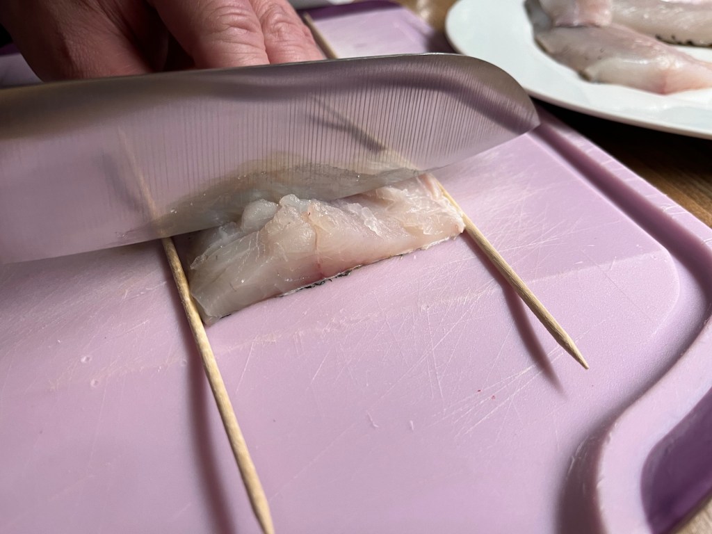 Da ich nicht das 800 g Schwanzstück eines mutmaßlichen Meterhechtes hatte, sondern nur ca. 500 g Filet meines Fanges, wollte ich dies direkt braten, ohne die Stücke vorher zu pochieren. Das Problem mit den Gräten lösten wir durch Schröpfen und ein paar Spritzer Balsamico bianco.