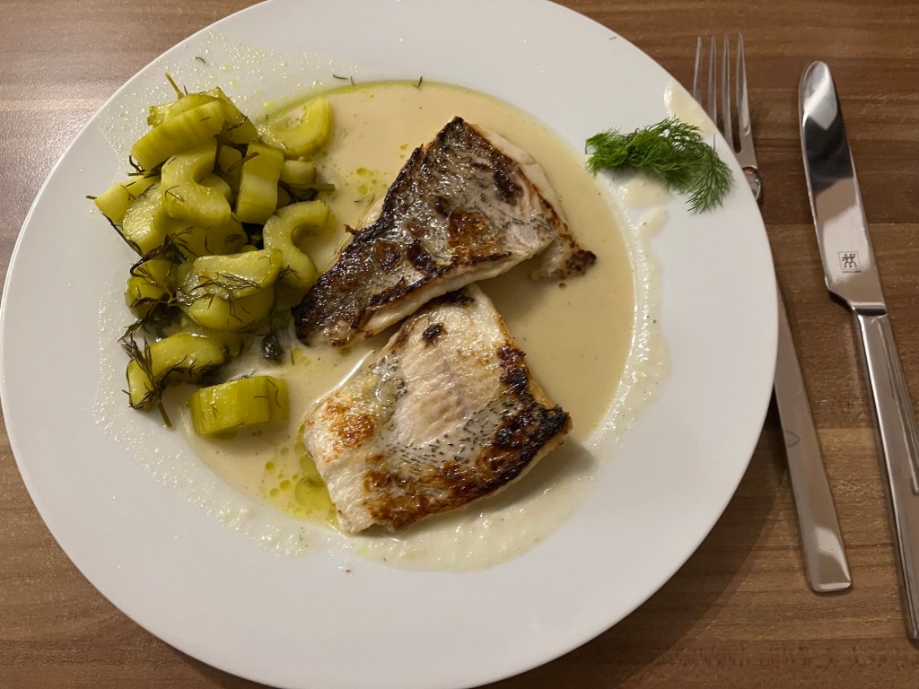 Geschmacklich war es sehr gut und stimmig. Die „eingelegten“ Gurken setzten schöne Akzente zum Hecht. Ob eine extra Sauce nötig ist, darüber lässt sich sicher streiten. Alternativ dazu könnte man auch einen Becher Sahne in den Gurkensud geben. Noch einfacher und schneller geht es, wenn man 1-2 Gläser Senfgurken (aus dem Spreewald) aufkocht und dort Sahne oder Créme Fraíche hinzugibt.