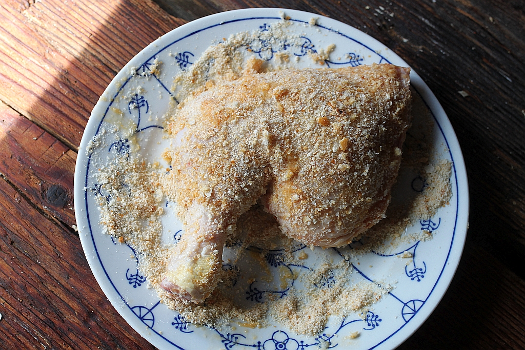Die Hähnchenteile, ich hatte Hähnchenschenkel, also keine ganzen Hühner, waschen, trocken tupfen und laut dem Wiener Rezept ohne Haut ein wenig einschneiden, um die Garzeit zu verringern, ich hatte sie mit Haut. Die Teile salzen, die Petersilie waschen und trocken tupfen.