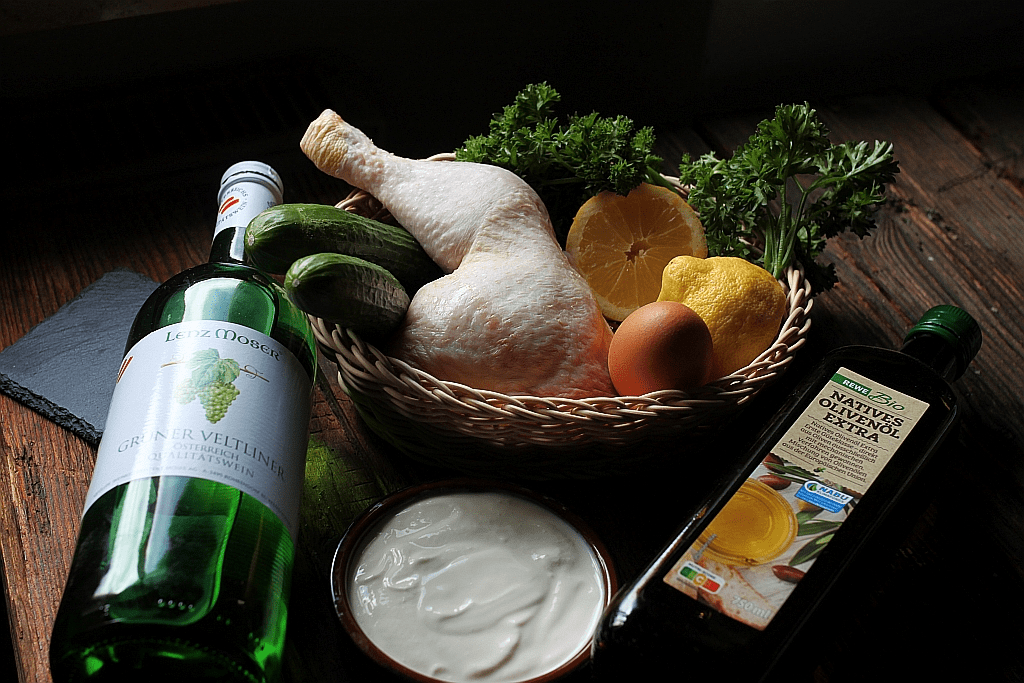 Hähnchenteile – meine Schenkel waren riesig – normal zu zweit in ein Körbchen auf Papier geben. Mit der frittierten Petersilie belegen und mit den Zitronenvirtel dekorieren. Rahm-Gurken-Salat. Dazu empfiehlt das Buch den Grünen Veltliner aus der Wachau.