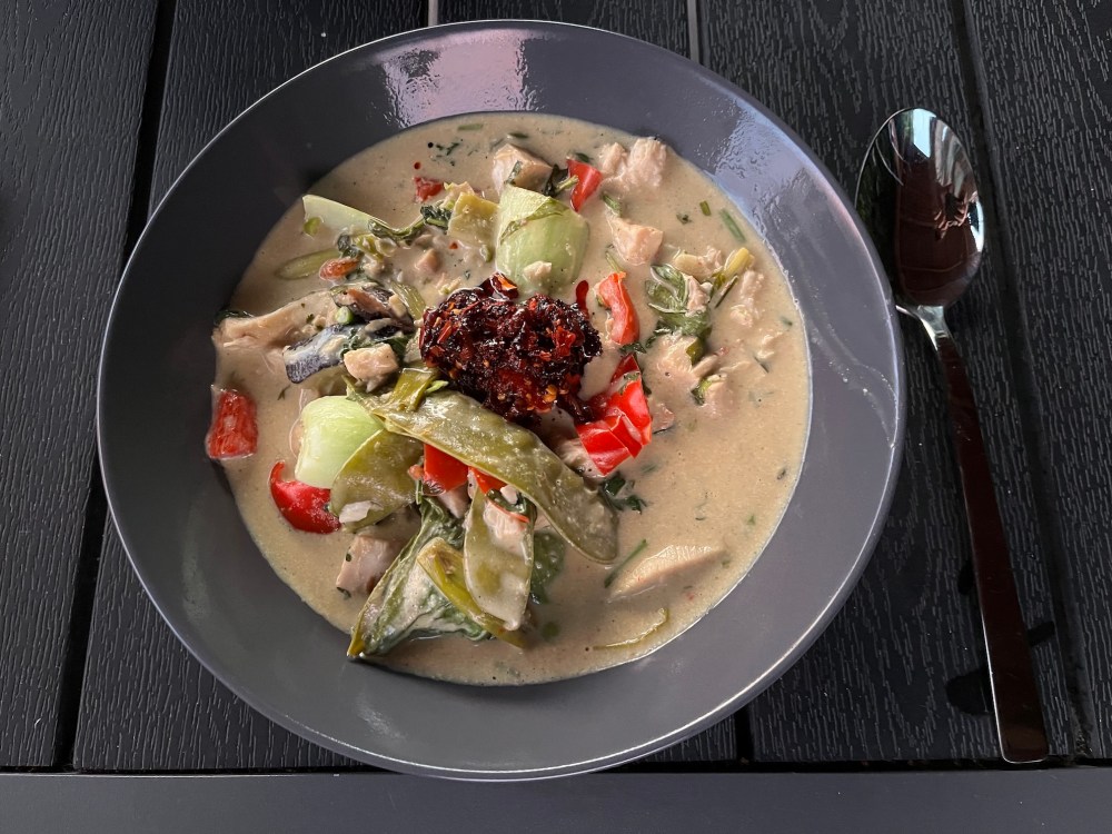 Das Sesamöl in einem Topf erhitzen, das klein geschnittene Gemüse und die Zuckerschoten im Ganzen hinzugeben. Alles mit Meersalz würzen, scharf anbraten, dann das Curry kurz mit anschwitzen. Mit der Kokosmilch ablöschen und alles zusammen bei geschlossenem Deckel etwa zehn Minuten köcheln lassen. Dann den Fisch hinzugeben und weiter acht bis zehn Minuten im Curry gar ziehen lassen – keinesfalls mehr kochen! Mit Soja- und Fischsoße sowie Limettensaft und Salz/Pfeffer abschmecken. Zum Schluß Koriander und Pak-Choi hinzugeben, beides grob geschnitten.