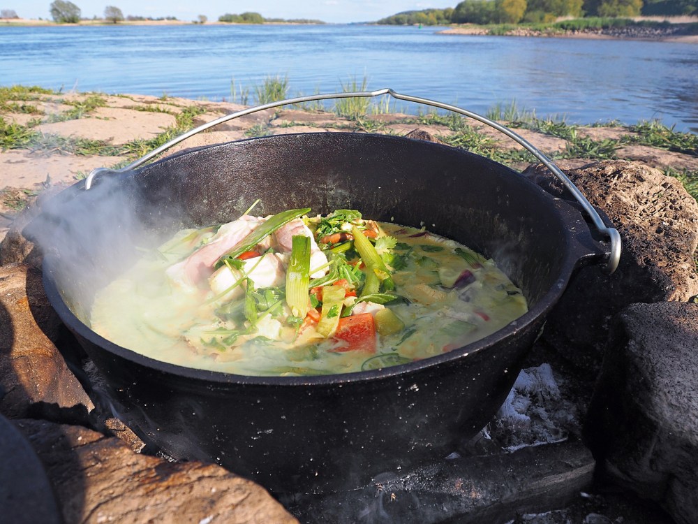 Bei sommerlichen Temperaturen ist man am besten in der Natur aufgehoben. Wenn man einen Garten sein Eigen nennt, drängt sich das Outdoor-Kochen förmlich auf. Grillen ist da meist die erste Wahl, diesmal sollte aber mal wieder der Dutch Oven aufs Feuer kommen. Da im Sommer leichte Gerichte angebracht sind, entschied ich mich für ein Rezept aus dem Buch: Fischküche für Angler von Jörg Strehlow.